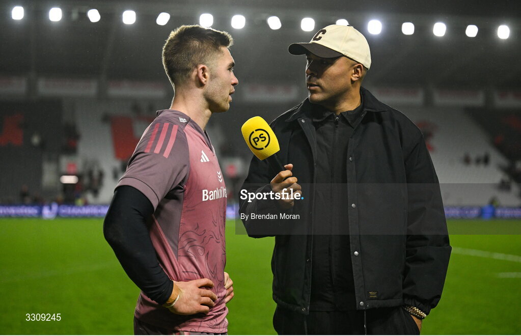 13 December 2025; Jack Crowley of Munster is interviewed by Premier Sports pundit Simon Zebo after the Investec Champions Cup match between Munster and Gloucester at SuperValu Páirc Ui Chaoimh in Cork. Photo by Brendan Moran/Sportsfile
