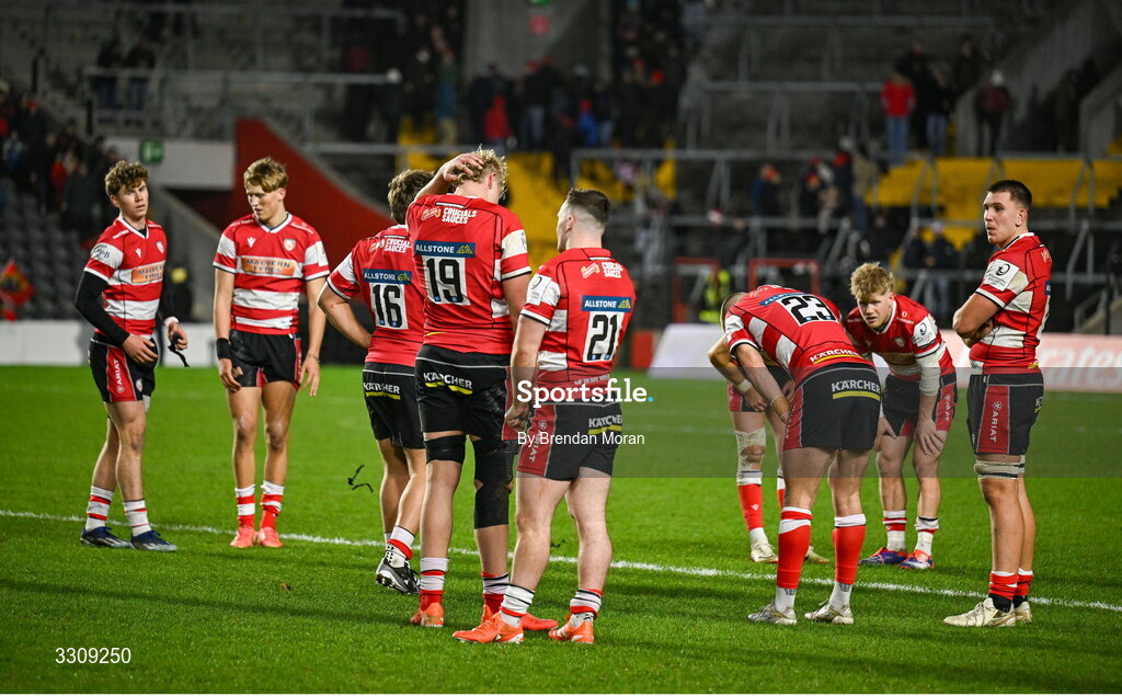 13 December 2025; Gloucester players react after their defeat in the Investec Champions Cup match between Munster and Gloucester at SuperValu Páirc Ui Chaoimh in Cork. Photo by Brendan Moran/Sportsfile