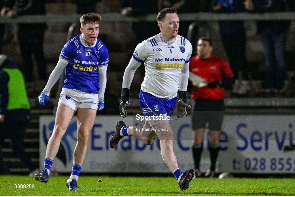 13 December 2025; Scotstown goalkeeper Rory Beggan celebrates with teammate Max Maguire, left, after kicking a free during the AIB Ulster GAA Football Senior Club Championship final match between Kilcoo and Scotstown at BOX-IT Athletic Grounds in Armagh. Photo by Ramsey Cardy/Sportsfile
