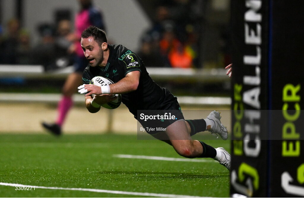 13 December 2025; Caolin Blade of Connacht dives over to score his side's third try during the EPCR Challenge Cup match between Connacht and Black Lion at Dexcom Stadium in Galway. Photo by Tyler Miller/Sportsfile