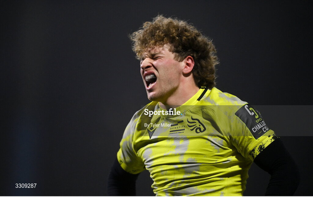 13 December 2025; Luka Takaishvili of Black Lion reacts after his side concede a fifth try during the EPCR Challenge Cup match between Connacht and Black Lion at Dexcom Stadium in Galway. Photo by Tyler Miller/Sportsfile