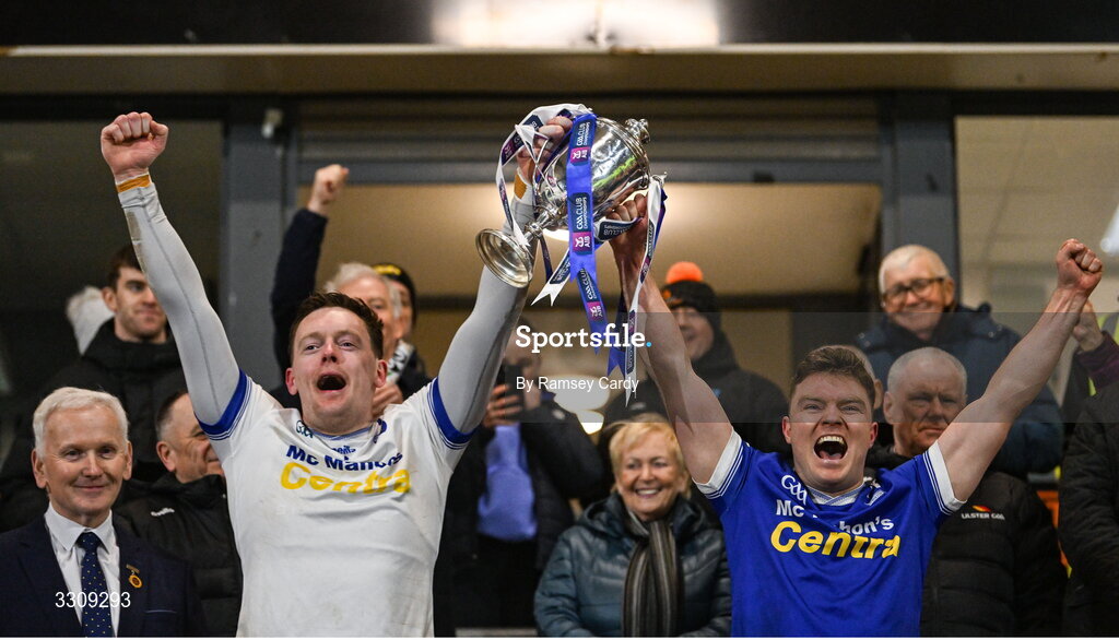 13 December 2025; Rory Beggan, left, and Conor McCarthy of Scotstown lift the trophy after the AIB Ulster GAA Football Senior Club Championship final match between Kilcoo and Scotstown at BOX-IT Athletic Grounds in Armagh. Photo by Ramsey Cardy/Sportsfile