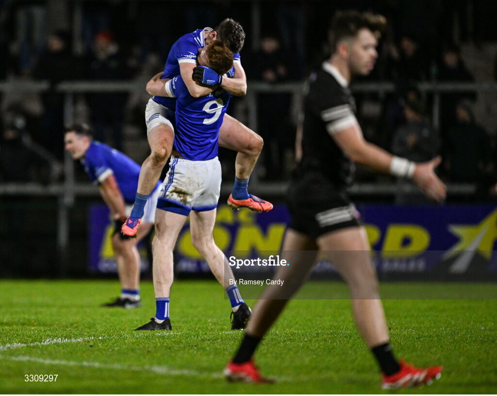 13 December 2025; Darren Hughes, left, and Gavin McPhillips of Scotstown celebrate after the AIB Ulster GAA Football Senior Club Championship final match between Kilcoo and Scotstown at BOX-IT Athletic Grounds in Armagh. Photo by Ramsey Cardy/Sportsfile