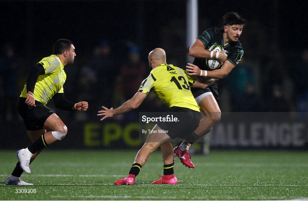 13 December 2025; Chay Mullins of Connacht in action against Demi Tapladze of Black Lion during the EPCR Challenge Cup match between Connacht and Black Lion at Dexcom Stadium in Galway. Photo by Tyler Miller/Sportsfile
