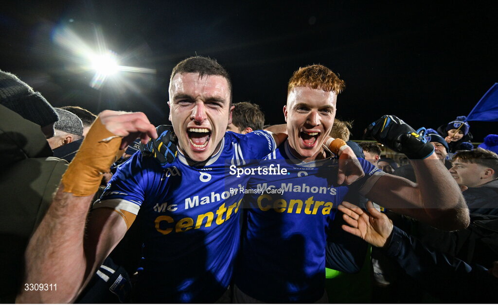 13 December 2025; Mícheál McCarville, left, and Gavin McPhillips of Scotstown celebrate after the AIB Ulster GAA Football Senior Club Championship final match between Kilcoo and Scotstown at BOX-IT Athletic Grounds in Armagh. Photo by Ramsey Cardy/Sportsfile