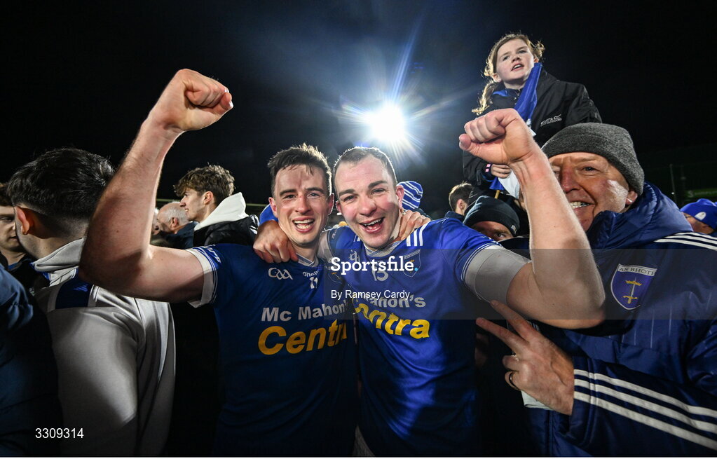 13 December 2025; Shane Carey, left, and Jack McCarron of Scotstown celebrate after the AIB Ulster GAA Football Senior Club Championship final match between Kilcoo and Scotstown at BOX-IT Athletic Grounds in Armagh. Photo by Ramsey Cardy/Sportsfile