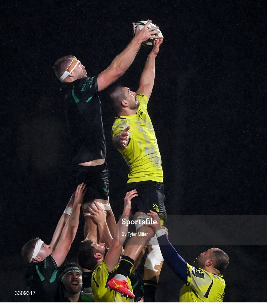 13 December 2025; Darragh Murray of Connacht and Demuri Epremidze of Black Lion battle for possession in a line-out during the EPCR Challenge Cup match between Connacht and Black Lion at Dexcom Stadium in Galway. Photo by Tyler Miller/Sportsfile