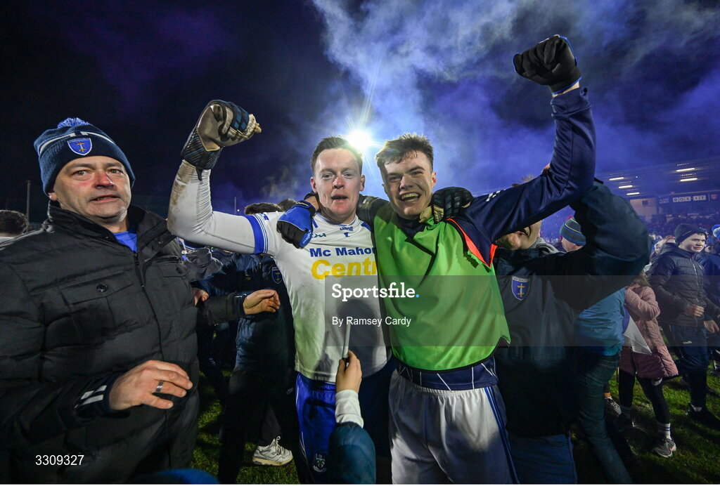 13 December 2025; Rory Beggan, left, and Mark McPhillips of Scotstown celebrate after the AIB Ulster GAA Football Senior Club Championship final match between Kilcoo and Scotstown at BOX-IT Athletic Grounds in Armagh. Photo by Ramsey Cardy/Sportsfile