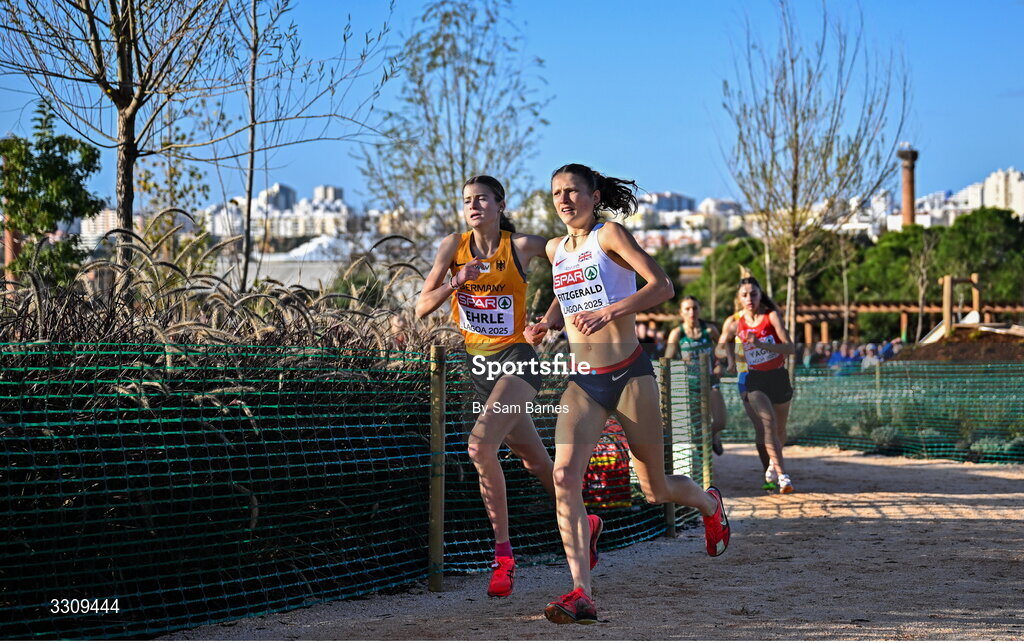 14 December 2025; Julia Ehrle of Germany, left, and Innes Fitzgerald of United Kingdom during the U20 women's race at the 2025 SPAR European Cross Country Championships in Lagoa, Portugal. Photo by Sam Barnes/Sportsfile