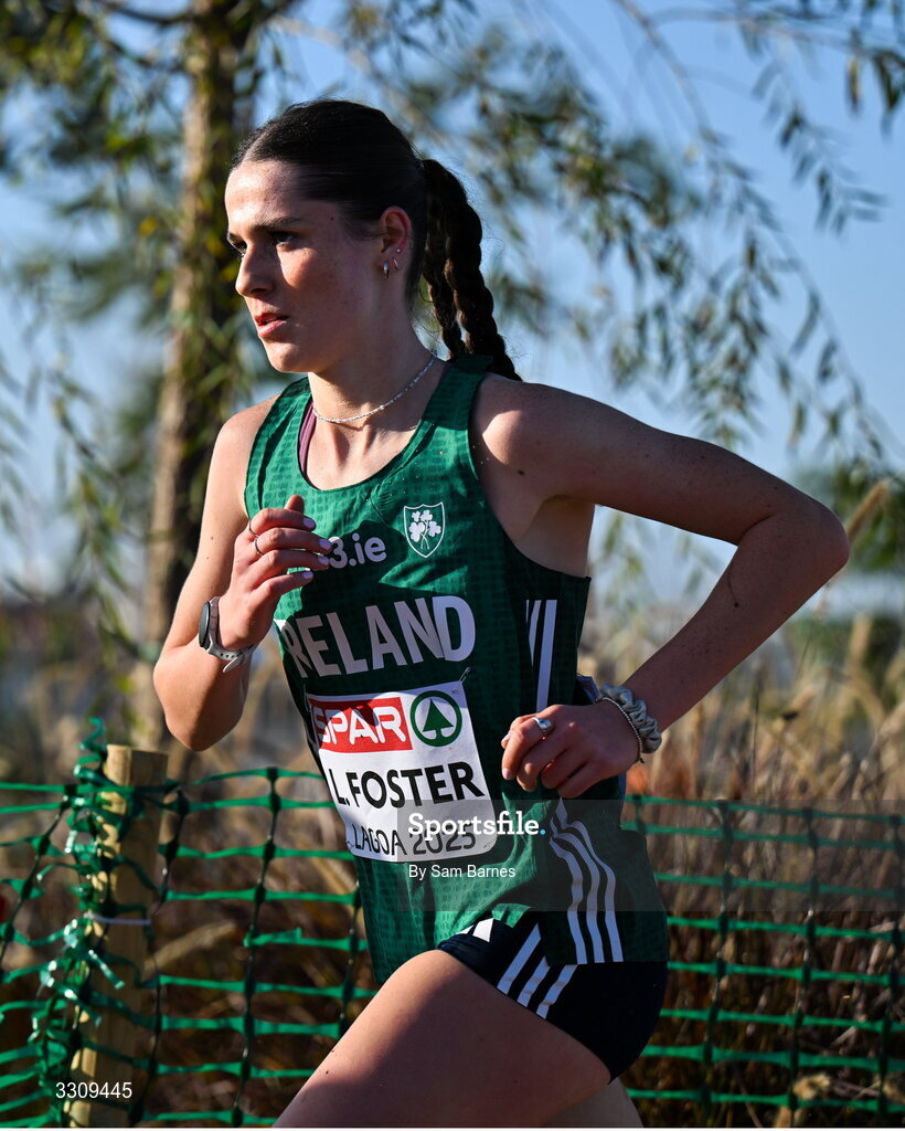 14 December 2025; Lucy Foster of Ireland during the U20 women's race at the 2025 SPAR European Cross Country Championships in Lagoa, Portugal. Photo by Sam Barnes/Sportsfile