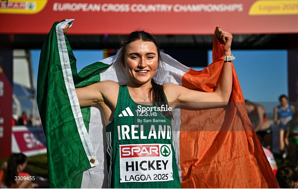 14 December 2025; Emma Hickey of Ireland celebrates finishing third in the U20 women's race at the 2025 SPAR European Cross Country Championships in Lagoa, Portugal. Photo by Sam Barnes/Sportsfile