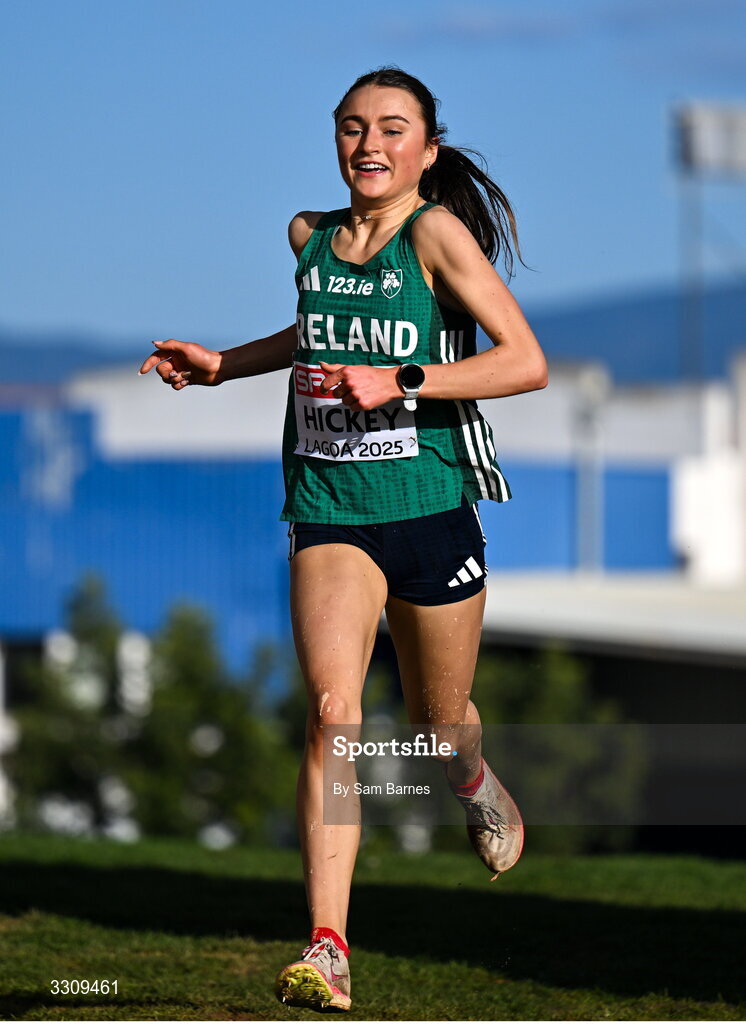 14 December 2025; Emma Hickey of Ireland celebrates finishing third in the U20 women's race at the 2025 SPAR European Cross Country Championships in Lagoa, Portugal. Photo by Sam Barnes/Sportsfile