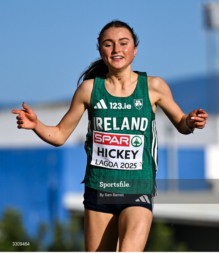 14 December 2025; Emma Hickey of Ireland celebrates finishing third in the U20 women's race at the 2025 SPAR European Cross Country Championships in Lagoa, Portugal. Photo by Sam Barnes/Sportsfile