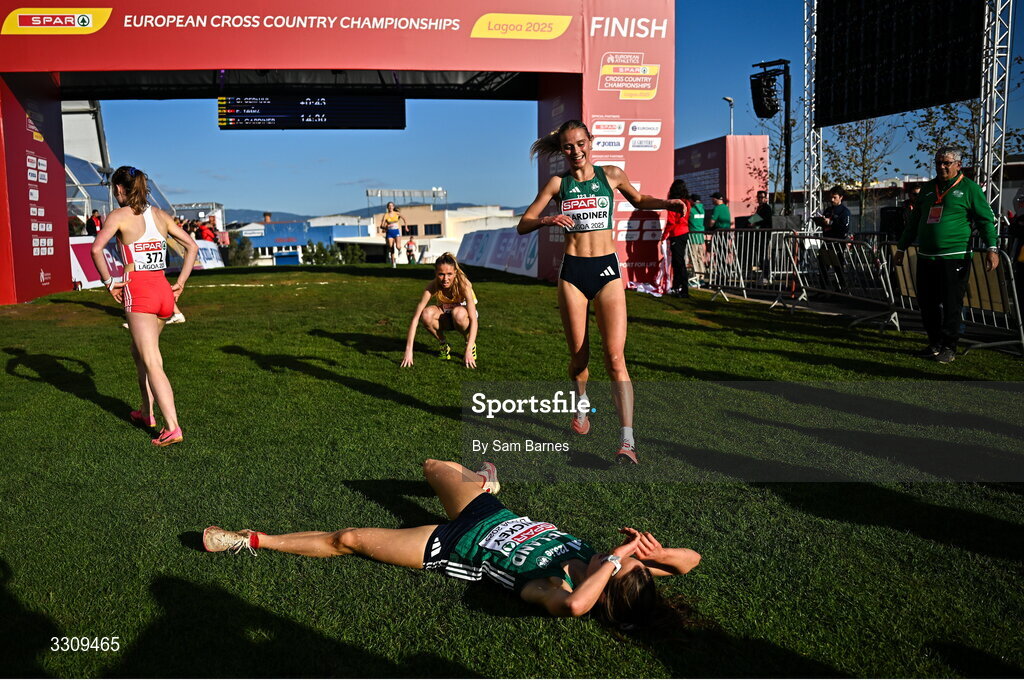 14 December 2025; Emma Hickey of Ireland reacts after finishing third in the U20 women's race at the 2025 SPAR European Cross Country Championships in Lagoa, Portugal. Photo by Sam Barnes/Sportsfile