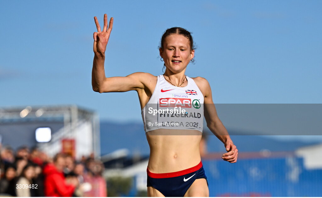 14 December 2025; Innes Fitzgerald of United Kingdom celebrates winning the U20 women's race at the 2025 SPAR European Cross Country Championships in Lagoa, Portugal. Photo by Sam Barnes/Sportsfile