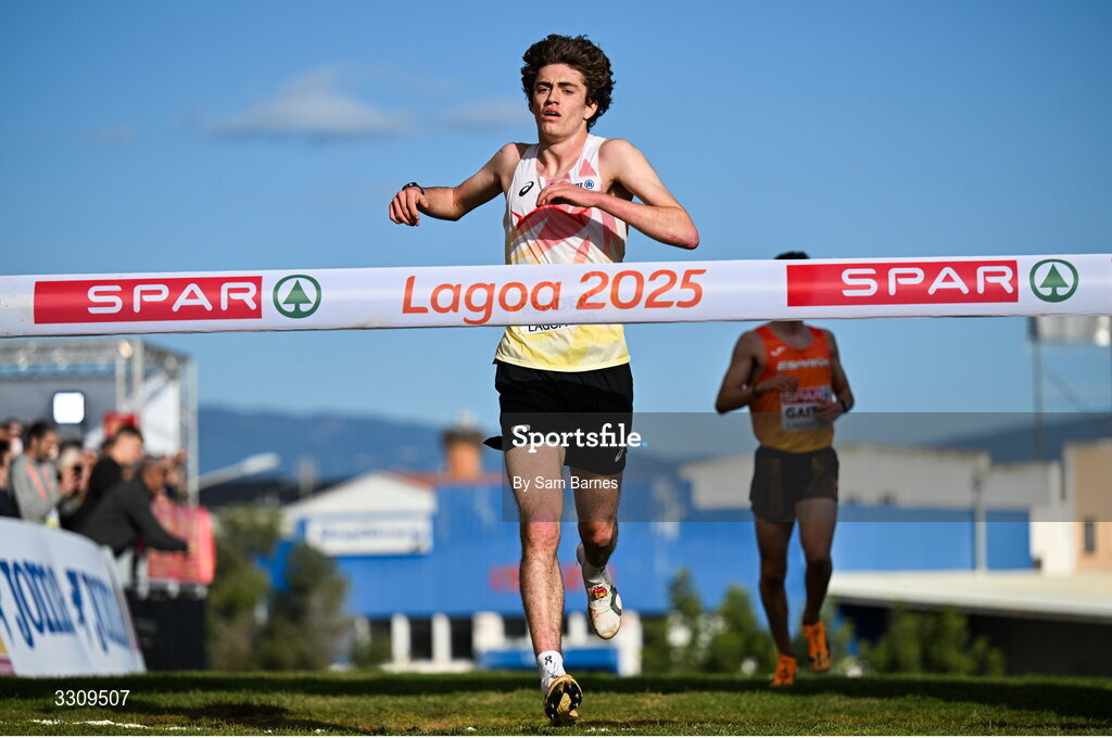 14 December 2025; Willem Renders of Belgium celebrates winning the U20 men's race at the 2025 SPAR European Cross Country Championships in Lagoa, Portugal. Photo by Sam Barnes/Sportsfile