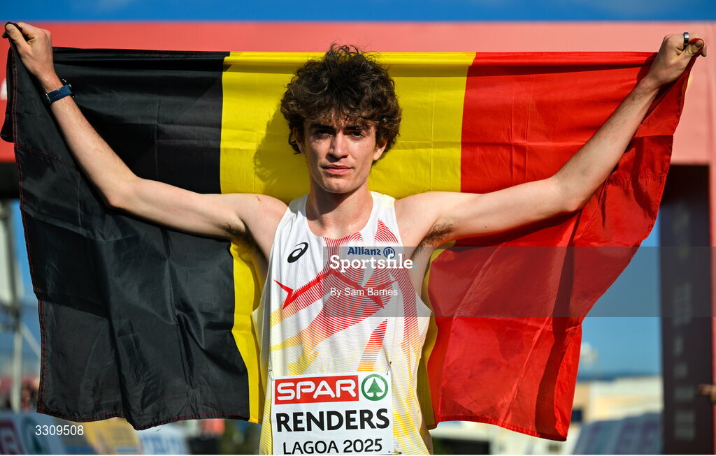 14 December 2025; Willem Renders of Belgium celebrates winning the U20 men's race at the 2025 SPAR European Cross Country Championships in Lagoa, Portugal. Photo by Sam Barnes/Sportsfile