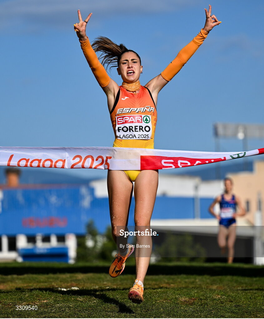 14 December 2025; Maria Forero of Spain celebrates winning the U23 women's race at the 2025 SPAR European Cross Country Championships in Lagoa, Portugal. Photo by Sam Barnes/Sportsfile