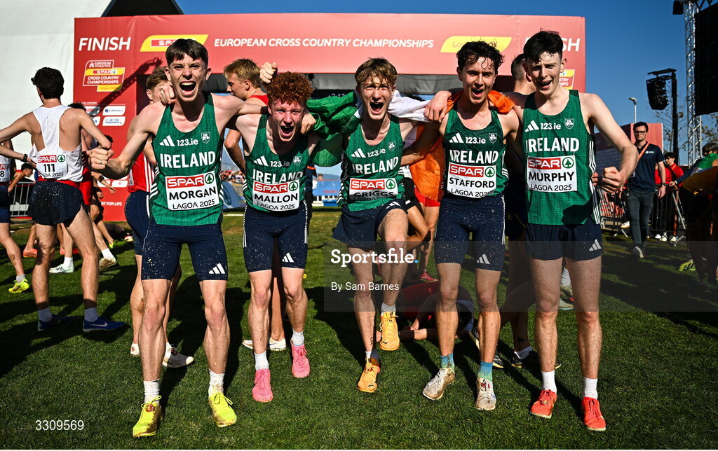 14 December 2025; The winning Ireland team, from left, Callum Morgan, Lughaidh Mallon, Nick Griggs, Jonas Stafford and Niall Murphy after the U23 men's race at the 2025 SPAR European Cross Country Championships in Lagoa, Portugal. Photo by Sam Barnes/Sportsfile