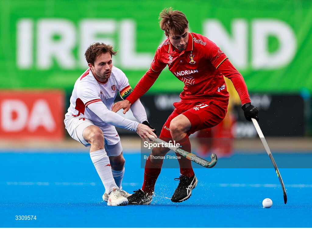 14 December 2025; Thomas Crols of Belgium in action against Zachary Wallace of England during the FIH Men's Hockey Pro League match between England and Belgium at the Sport Ireland Campus in Dublin. Photo by Thomas Flinkow/Sportsfile