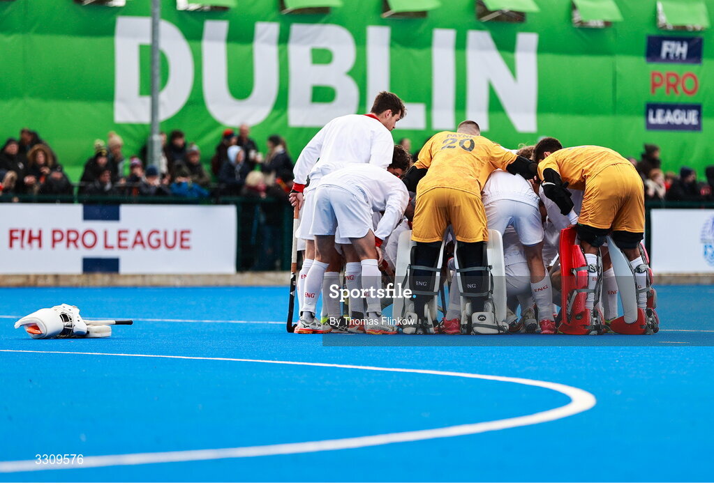 14 December 2025; England players huddle before the FIH Men's Hockey Pro League match between England and Belgium at the Sport Ireland Campus in Dublin. Photo by Thomas Flinkow/Sportsfile
