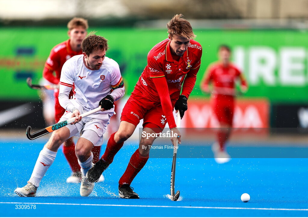14 December 2025; Thomas Crols of Belgium in action against Zachary Wallace of England during the FIH Men's Hockey Pro League match between England and Belgium at the Sport Ireland Campus in Dublin. Photo by Thomas Flinkow/Sportsfile