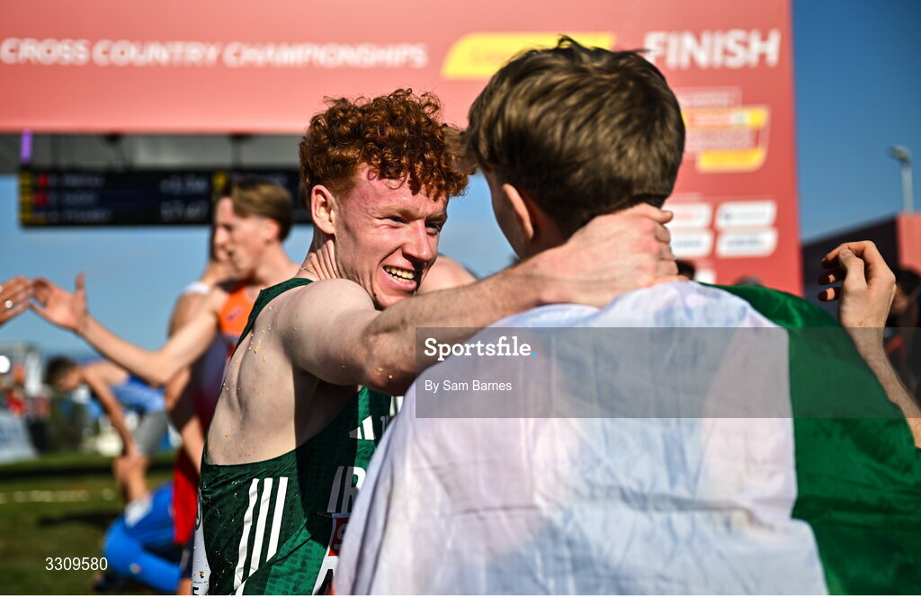14 December 2025; Lughaidh Mallon of Ireland, left, congratulates Nick Griggs after Griggs won the U23 men's race at the 2025 SPAR European Cross Country Championships in Lagoa, Portugal. Photo by Sam Barnes/Sportsfile