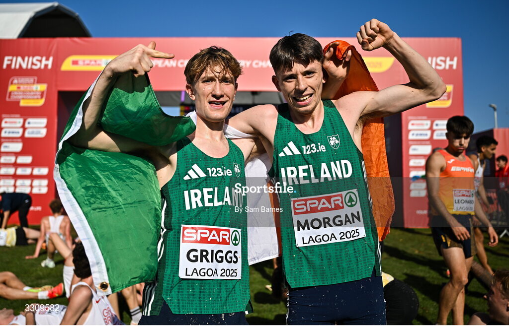 14 December 2025; Nick Griggs, left, and Callum Morgan of Ireland celebrate winning the the U23 men's team event at the 2025 SPAR European Cross Country Championships in Lagoa, Portugal. Photo by Sam Barnes/Sportsfile