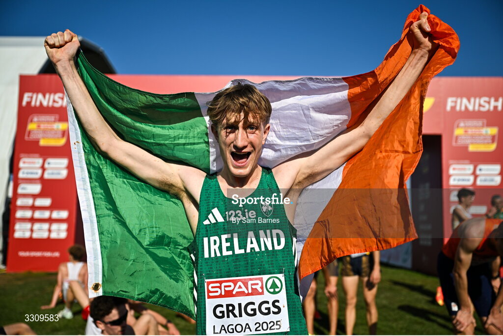 14 December 2025; Nick Griggs of Ireland celebrates winning the U23 men's race at the 2025 SPAR European Cross Country Championships in Lagoa, Portugal. Photo by Sam Barnes/Sportsfile