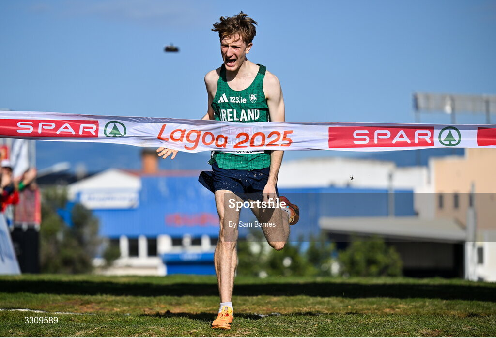 14 December 2025; Nick Griggs of Ireland celebrates winning the U23 men's race at the 2025 SPAR European Cross Country Championships in Lagoa, Portugal. Photo by Sam Barnes/Sportsfile