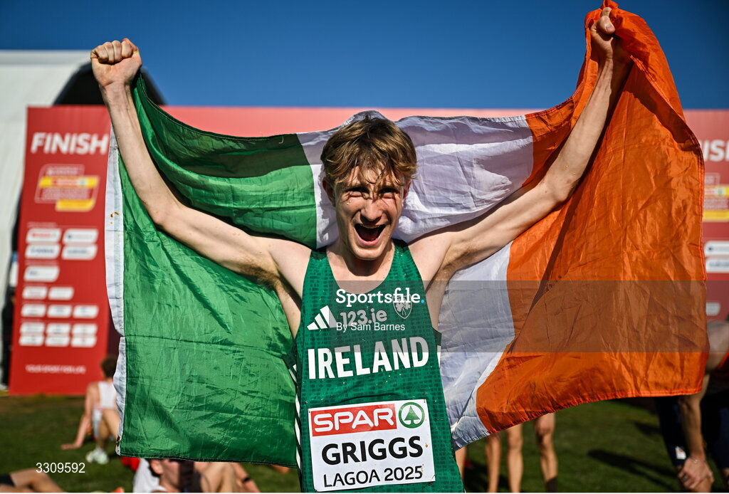 14 December 2025; Nick Griggs of Ireland celebrates winning the U23 men's race at the 2025 SPAR European Cross Country Championships in Lagoa, Portugal. Photo by Sam Barnes/Sportsfile