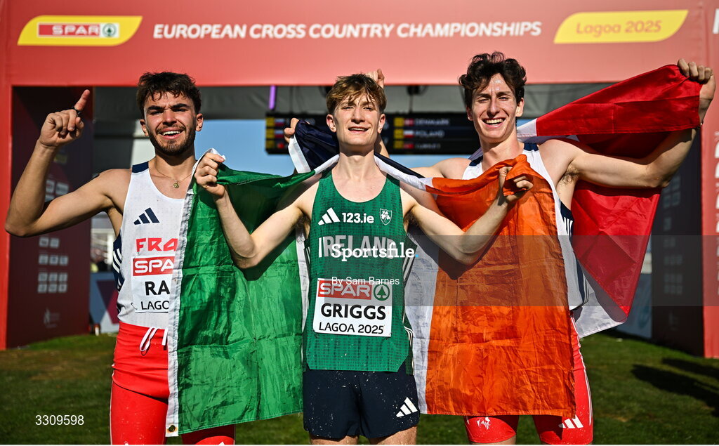 14 December 2025; The U23 men's podium, from left, second place Aurelien Radja of France, race winner Nick Griggs of Ireland and third place Pierre Boudy of France, after the U23 men's race at the 2025 SPAR European Cross Country Championships in Lagoa, Portugal. Photo by Sam Barnes/Sportsfile