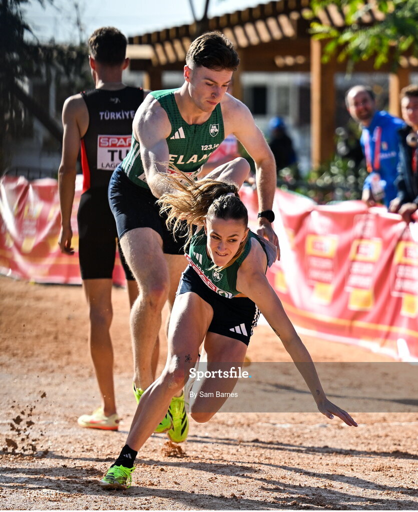 14 December 2025; Laura Nicholson of Ireland collides with Ireland teammate Cian McPhillips on the changeover during the U23 men's race at the 2025 SPAR European Cross Country Championships in Lagoa, Portugal. Photo by Sam Barnes/Sportsfile