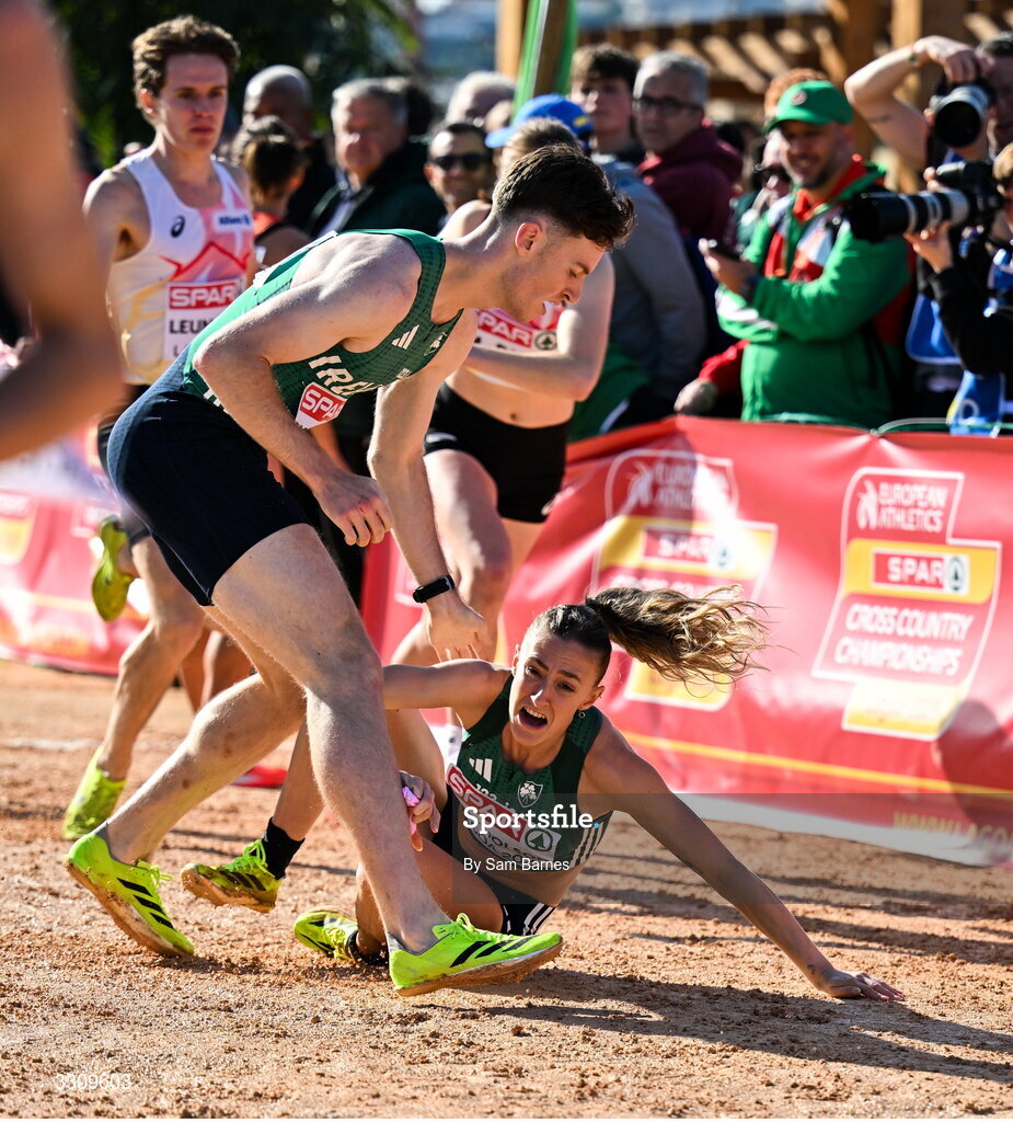 14 December 2025; Laura Nicholson of Ireland collides with Ireland teammate Cian McPhillips on the changeover during the U23 men's race at the 2025 SPAR European Cross Country Championships in Lagoa, Portugal. Photo by Sam Barnes/Sportsfile