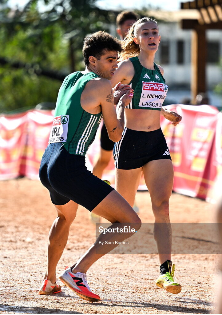 14 December 2025; Andrew Coscoran, left, and Laura Nicholson of Ireland during the mixed relay race at the 2025 SPAR European Cross Country Championships in Lagoa, Portugal. Photo by Sam Barnes/Sportsfile
