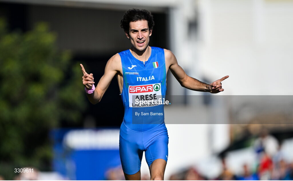 14 December 2025; Pietro Arese of Italy celebrates his team winning the mixed relay race at the 2025 SPAR European Cross Country Championships in Lagoa, Portugal. Photo by Sam Barnes/Sportsfile