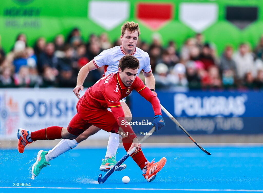 14 December 2025; Arthur de Sloover of Belgium in action against James Oates of England during the FIH Men's Hockey Pro League match between England and Belgium at the Sport Ireland Campus in Dublin. Photo by Thomas Flinkow/Sportsfile