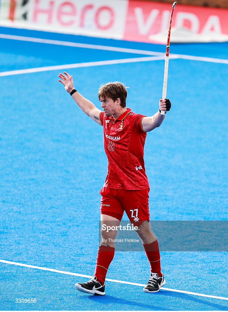 14 December 2025; Tom Boon of Belgium celebrates after scoring his side's third goal during the FIH Men's Hockey Pro League match between England and Belgium at the Sport Ireland Campus in Dublin. Photo by Thomas Flinkow/Sportsfile