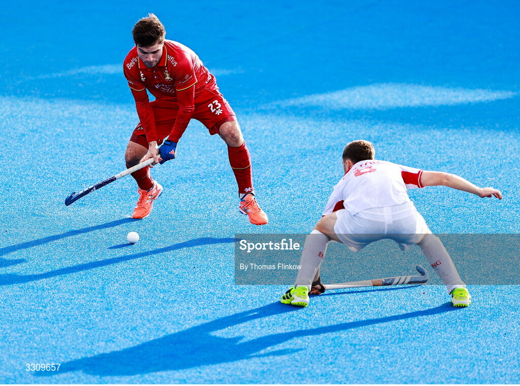 14 December 2025; Arthur de Sloover of Belgium in action against Jacob Payton of England during the FIH Men's Hockey Pro League match between England and Belgium at the Sport Ireland Campus in Dublin. Photo by Thomas Flinkow/Sportsfile