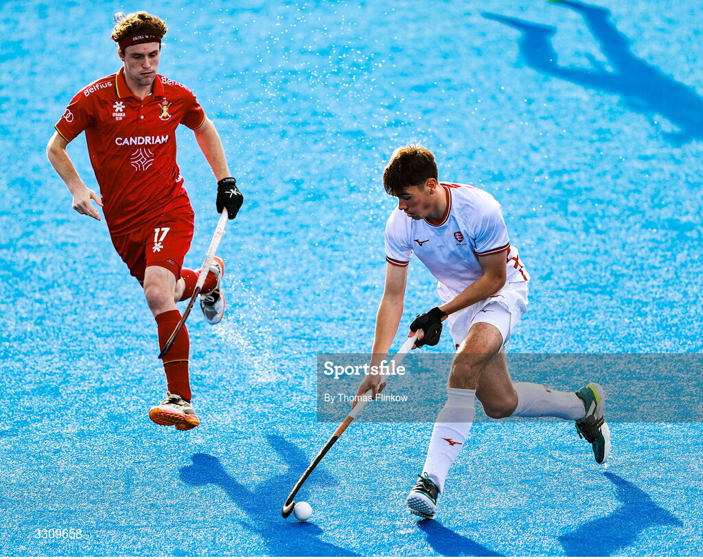 14 December 2025; Samuel Taylor of England in action against Guillaume Hellin of Belgium during the FIH Men's Hockey Pro League match between England and Belgium at the Sport Ireland Campus in Dublin. Photo by Thomas Flinkow/Sportsfile