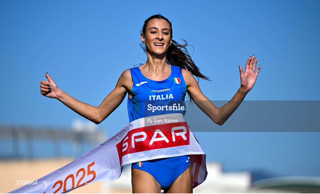 14 December 2025; Nadia Battocletti of Italy celebrates winning the senior women's race at the 2025 SPAR European Cross Country Championships in Lagoa, Portugal. Photo by Sam Barnes/Sportsfile