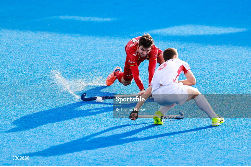 14 December 2025; Arthur de Sloover of Belgium in action against Jacob Payton of England during the FIH Men's Hockey Pro League match between England and Belgium at the Sport Ireland Campus in Dublin. Photo by Thomas Flinkow/Sportsfile