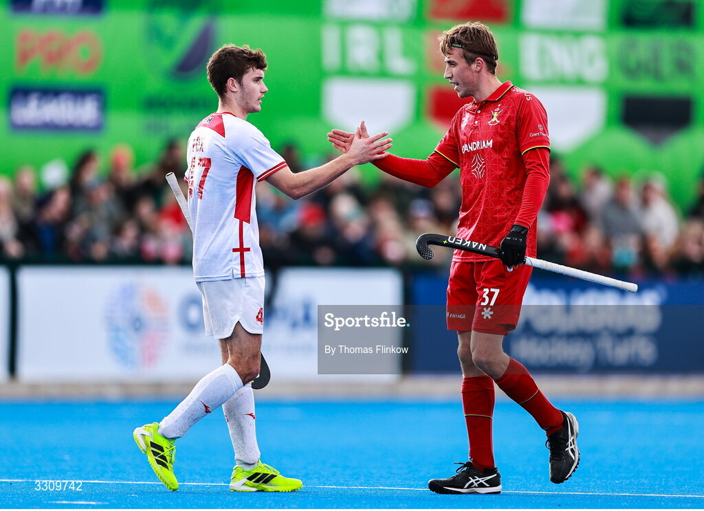 14 December 2025; Ben Fox of England and Thomas Crols of Belgium shake hands after the FIH Men's Hockey Pro League match between England and Belgium at the Sport Ireland Campus in Dublin. Photo by Thomas Flinkow/Sportsfile