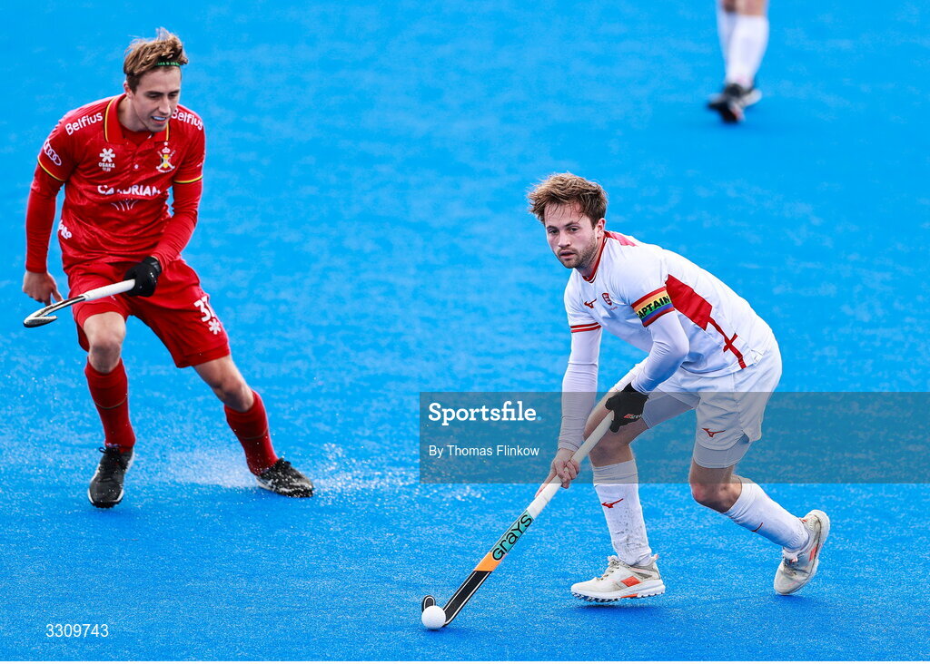 14 December 2025; Zachary Wallace of England in action against Thomas Crols of Belgium during the FIH Men's Hockey Pro League match between England and Belgium at the Sport Ireland Campus in Dublin. Photo by Thomas Flinkow/Sportsfile