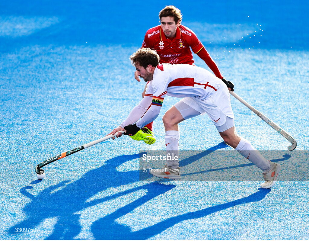 14 December 2025; Zachary Wallace of England in action against Thibeau Stockbroekx of Belgium during the FIH Men's Hockey Pro League match between England and Belgium at the Sport Ireland Campus in Dublin. Photo by Thomas Flinkow/Sportsfile