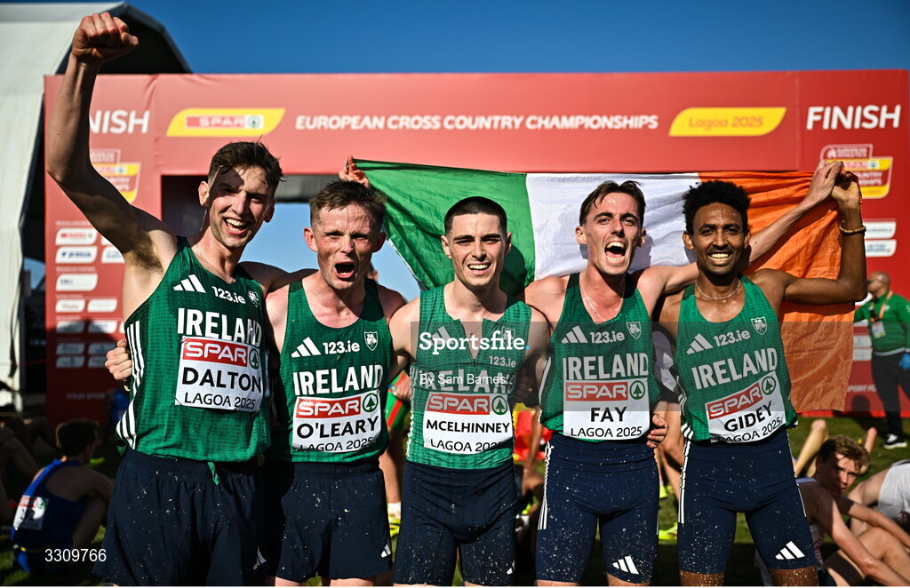 14 December 2025; The second place Ireland team, from left, Brian Fay, Efrem Gidey, Cormac Dalton, Jack O'Leary and Darragh McElhinney after the senior men's race at the 2025 SPAR European Cross Country Championships in Lagoa, Portugal. Photo by Sam Barnes/Sportsfile