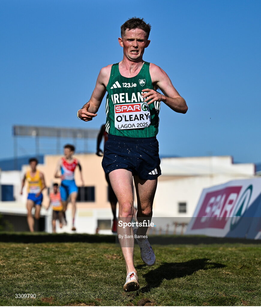 14 December 2025; Jack O'Leary of Ireland after finishng fifth in the senior men's race at the 2025 SPAR European Cross Country Championships in Lagoa, Portugal. Photo by Sam Barnes/Sportsfile