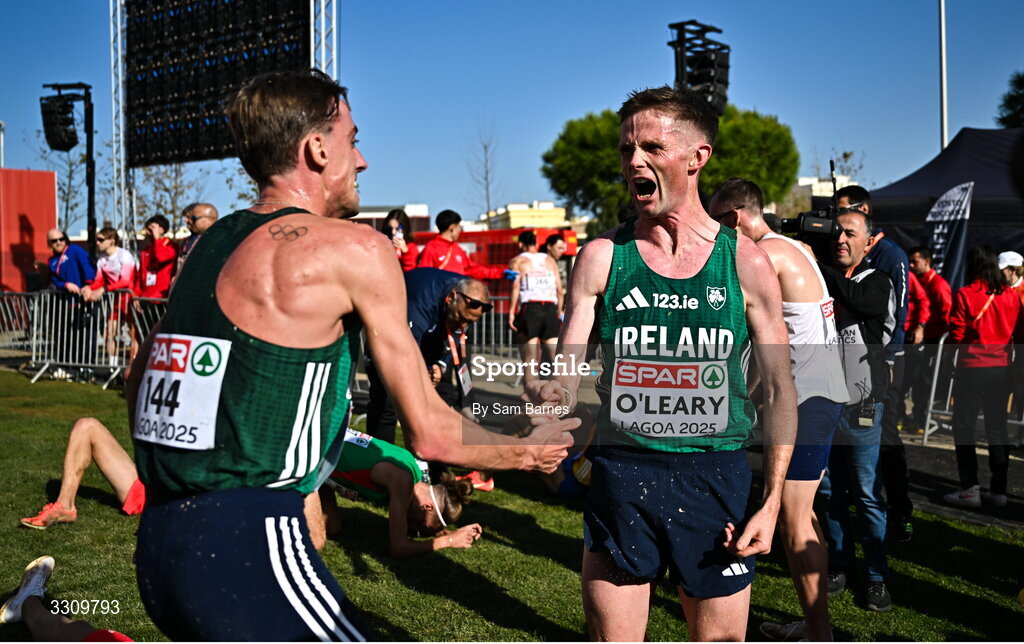 14 December 2025; Jack O'Leary, right, Brian Fay of Ireland after the senior men's race at the 2025 SPAR European Cross Country Championships in Lagoa, Portugal. Photo by Sam Barnes/Sportsfile