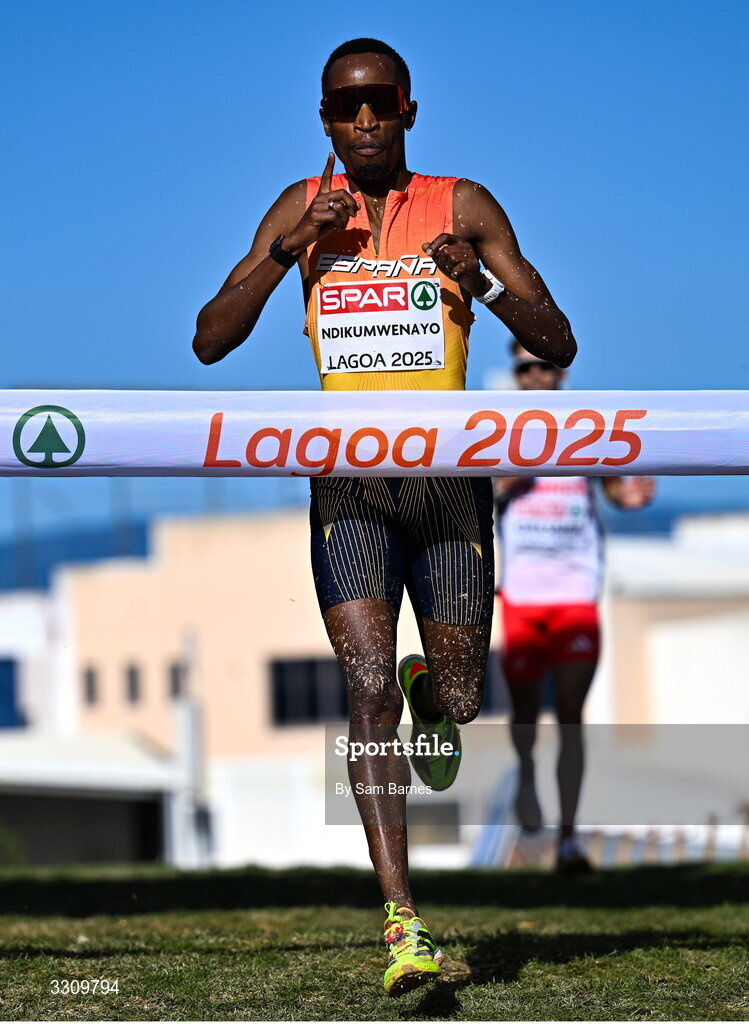 14 December 2025; Thierry Ndikumwenayo of Spain celebrates winning the senior men's race at the 2025 SPAR European Cross Country Championships in Lagoa, Portugal. Photo by Sam Barnes/Sportsfile