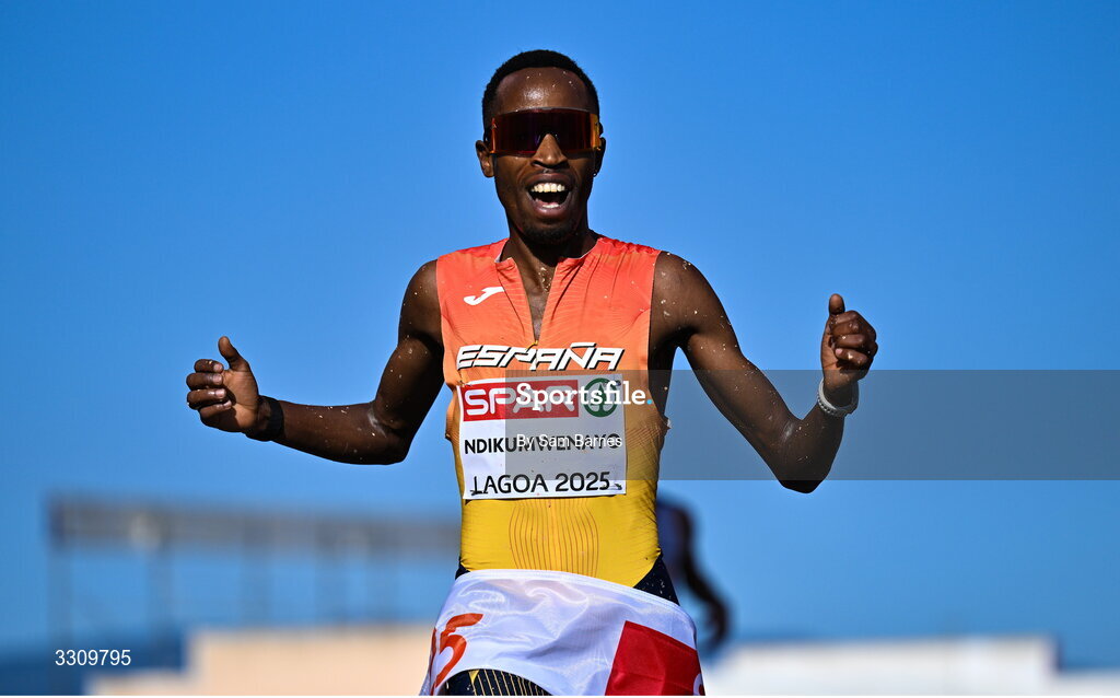 14 December 2025; Thierry Ndikumwenayo of Spain celebrates winning the senior men's race at the 2025 SPAR European Cross Country Championships in Lagoa, Portugal. Photo by Sam Barnes/Sportsfile